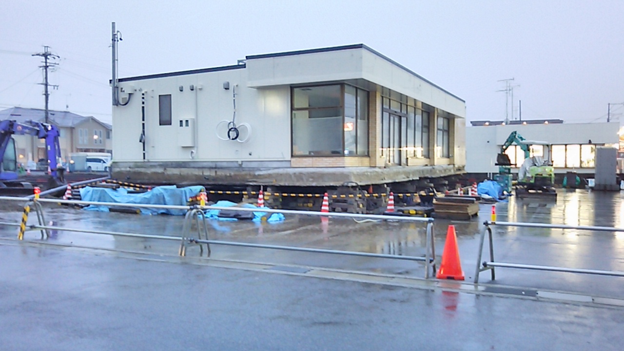 世にも珍しいコンビニの曳き家。表の駐車場を広げるため、後ろの土地へ建物を移動するようです。曳き家というと古民家移築のイメージが強いですが、こんな建物でも動かしてしまうんですねえ。