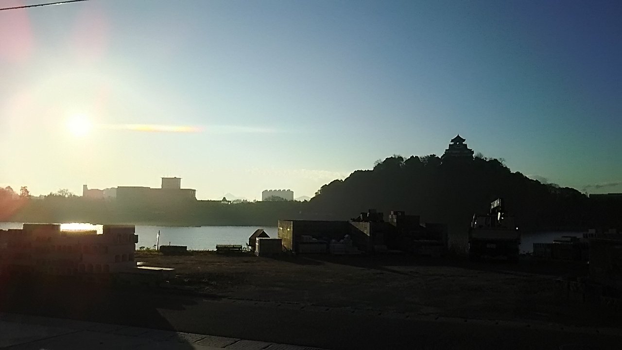 朝陽の逆光に聳える白帝城。なかなか荘厳な風景です。 いつも立ち寄る金物屋さんからの景色です。