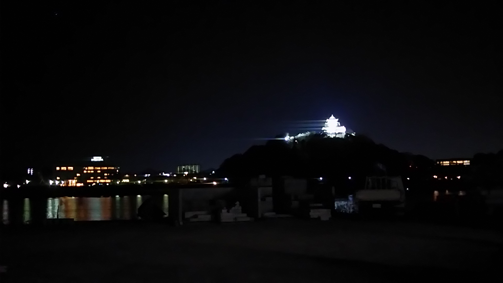 夜の白帝城、明るくライトアップされています。 今回も行きつけの金物屋さんから見た光景です。 この城はやはり川のこちら側から見た方がきれいです。