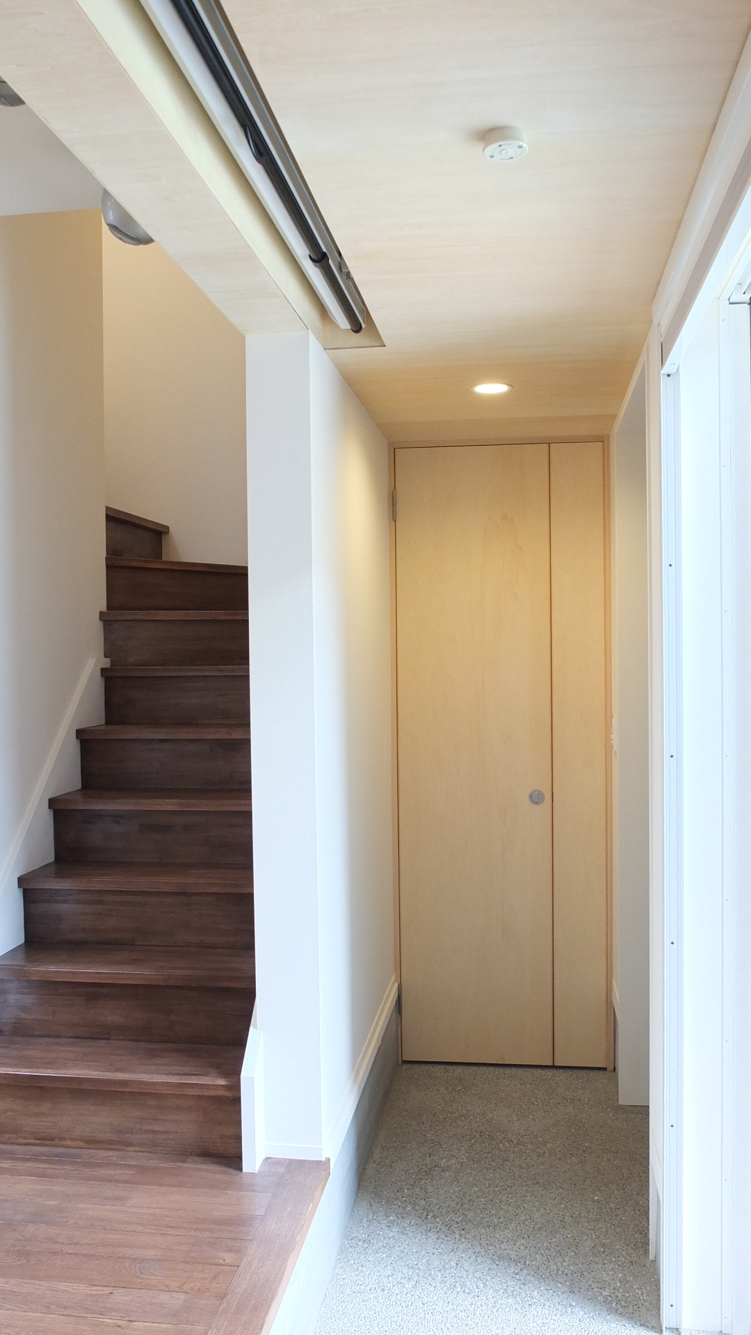 内部構成は中央を貫く『路地的スペース』となるLDKと吹抜、それらに付随する諸室が両サイドを挟み、路地的スペースを介してコミュニケーションが生まれます。各諸室は極めてコンパクトに、天井低くつくられていますが、路地的スペースとの関係性が閉塞感を感じさせません。