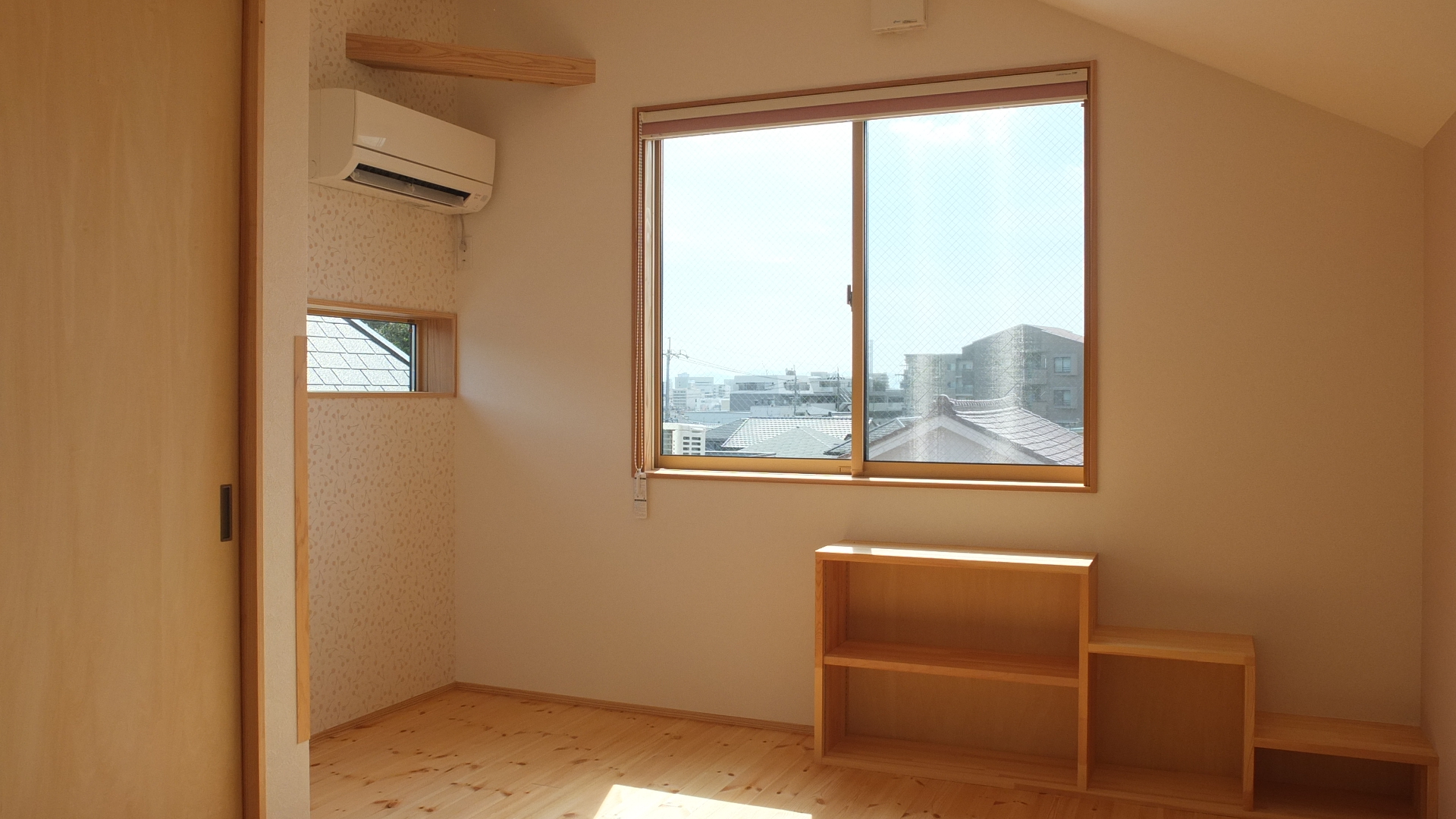 1年半ほど前に開催された完成見学会(『INandOUT』稲沢市mi様邸)に当時はまだ計画をスタートされたばかりのyoyo様がご来場されました。mi様邸には小さいお子さんが喜んで遊べる仕掛けがあちらこちらに、yoyo様の一人娘ERIちゃんも目を輝かせて体感していました。特にリビングから2階へと掛かるハシゴがお気に入りの様子で、ひとしきり見学を終えた後に『うちにもハシゴが欲しい』と。そんな話を聞いてしまった以上はこの筆者、『必ずつくってみせる!』と息巻いて計画に取り組みました。様々な制限を加味しながらプランを進め、リビングからERIちゃんの部屋へと続く『ヒミツの通路』としてのハシゴが完成しました。(実は『ヒミツの通路』とする事にも『準防火地域の三階建て』と『高度地区』の制限が少々関係してくるのです。)