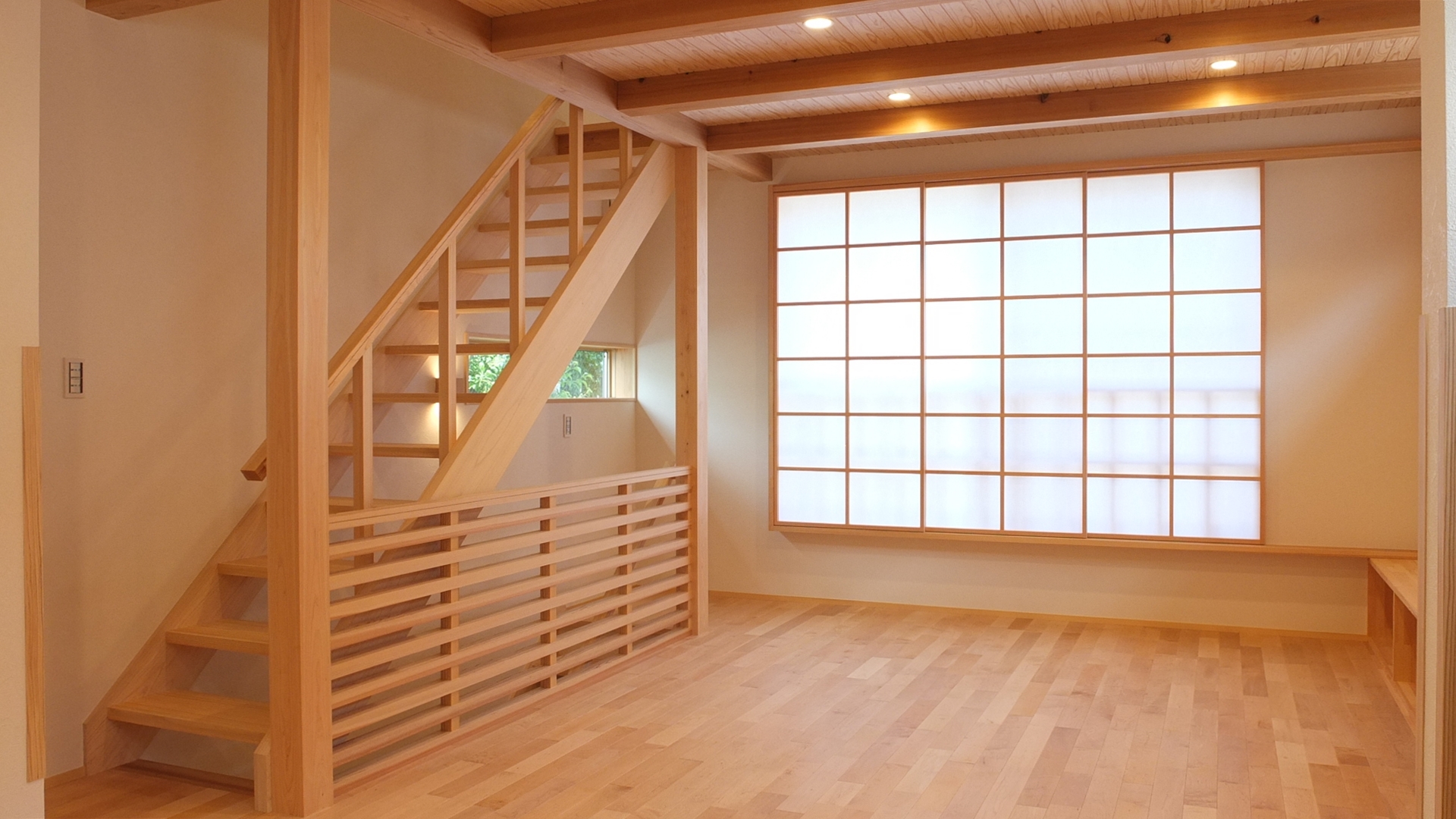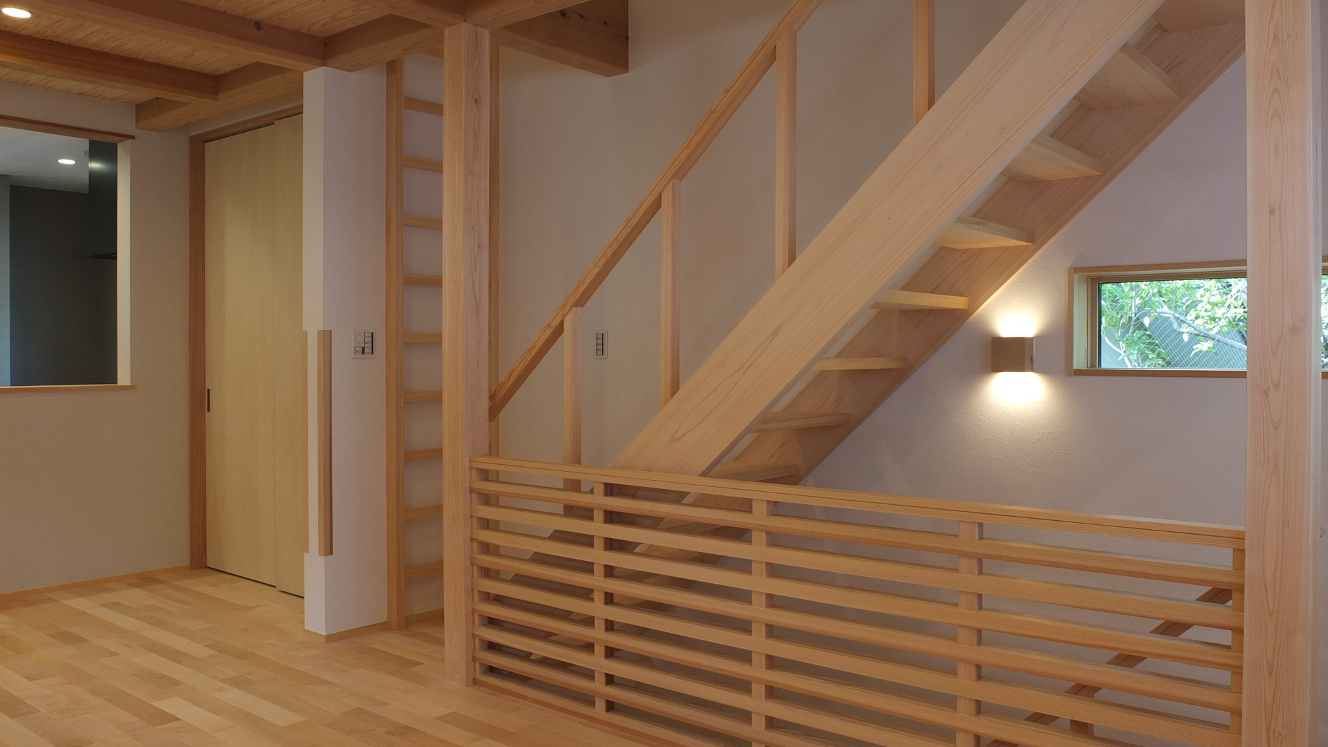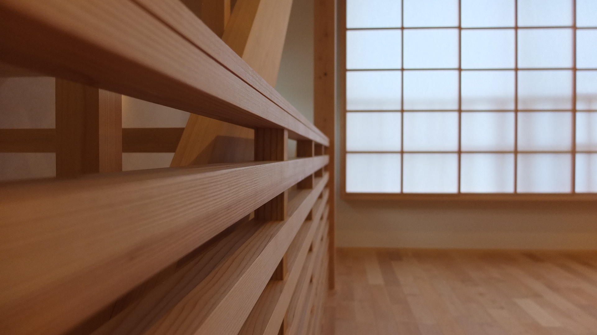 昨年のk保木棟梁に続き若手大工h谷川君が親方の元を離れて一人で担当した記念すべき住宅です。(狭小地で作業車の駐車スペースも限られるため、ハイ●ースに乗っている棟梁が多い中で唯一軽バンに乗っているh谷川君にお願いした、というのが真相ですが)先輩のk保木棟梁も手伝いに来てくれましたが、二人ともさすがは親方の元で厳しい修行をしてきただけあって、各所の収まりも非常にキレイでした。特に階段の手摺の造作は、どこからビスを打って固定しているのかが分からないような見事な加工。親方のk棟梁が『ずっと棟梁として飯を喰っていけるように』とh谷川君の腕に仕込んだ技術が早くも活かされた事例となりました。