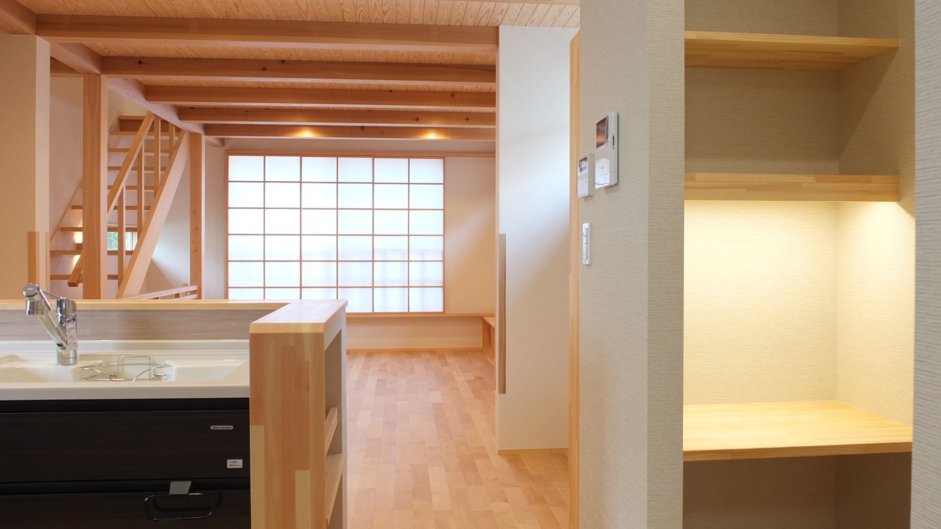 結果、コンパクトながらLDKは木表しのインテリアで広がりを感じられ、外部に対して閉じたいところは閉じ開きたいところは開く、ご近隣の樹木等の借景にも恵まれ、非常に印象的な空間となりました。