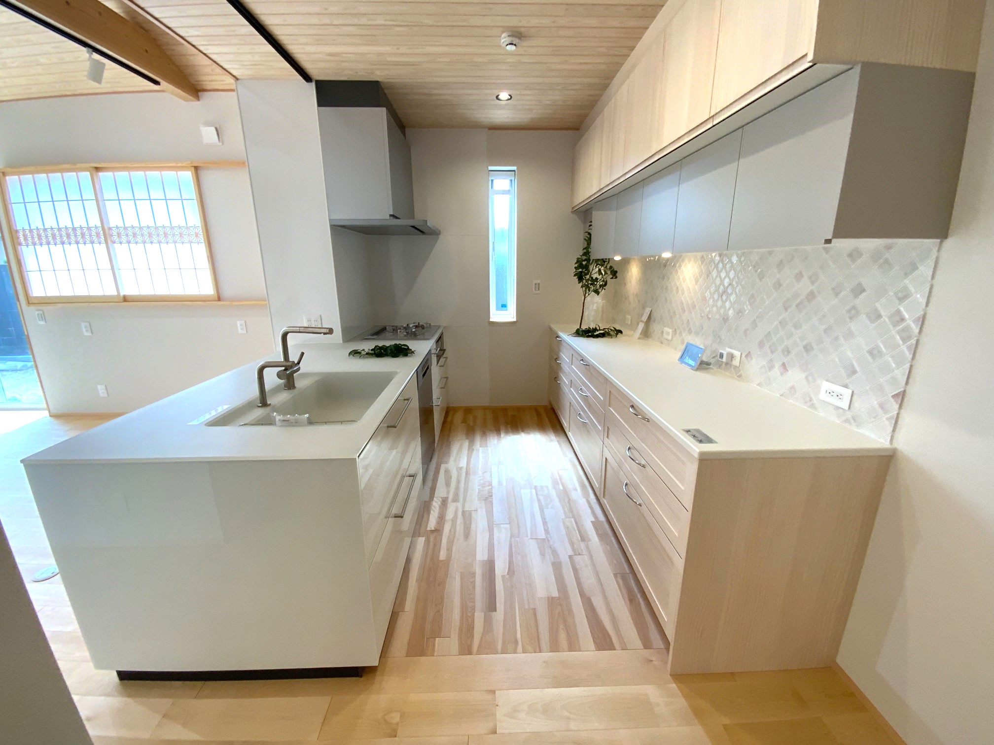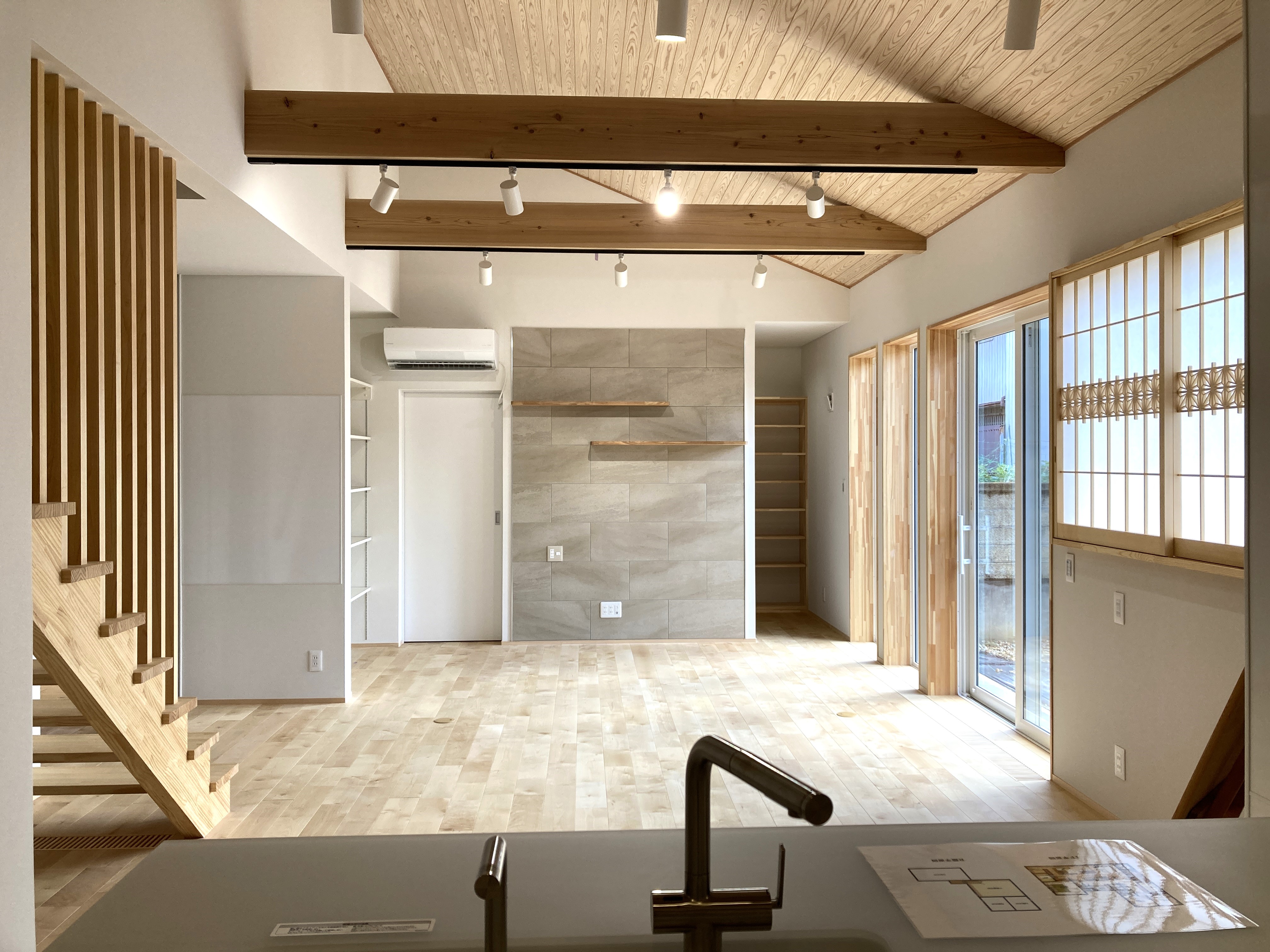 【延床面積】122.04㎡(36.91坪)/【工法】木造軸組工法/【断熱】基礎内:押出法ポリスチレンフォーム 外壁:高性能グラスウール+付加断熱高性能グラスウール 屋根:高性能グラスウール/【換気】第1種換気(熱交換換気扇)【屋根・外壁】屋根:平板瓦 外壁:ガルバリウム鋼板【開口部】樹脂サッシ【内装】床:カバ桜・桧材 壁:クロス・杉材・サワラ材 天井:クロス、杉材/【UA値】0.3【ηA値】1【C値】0.4