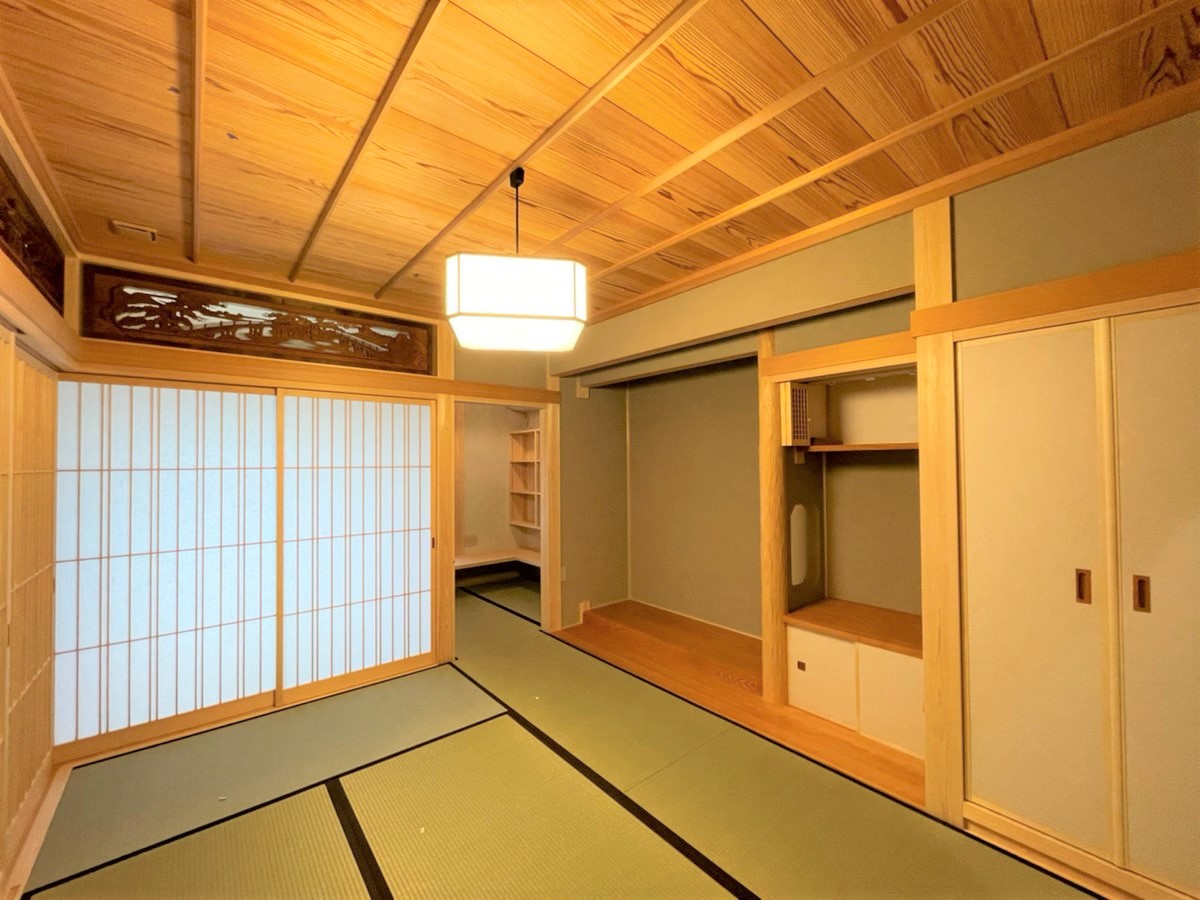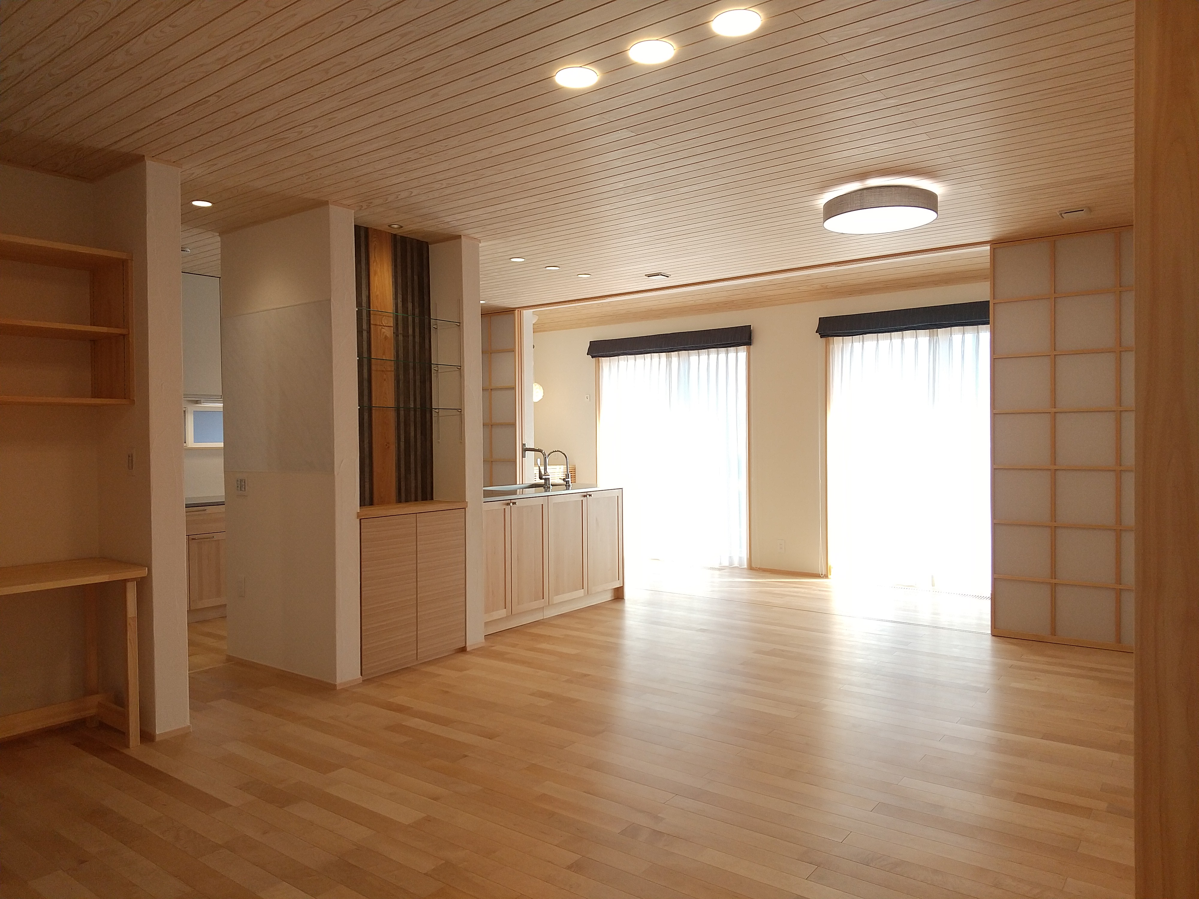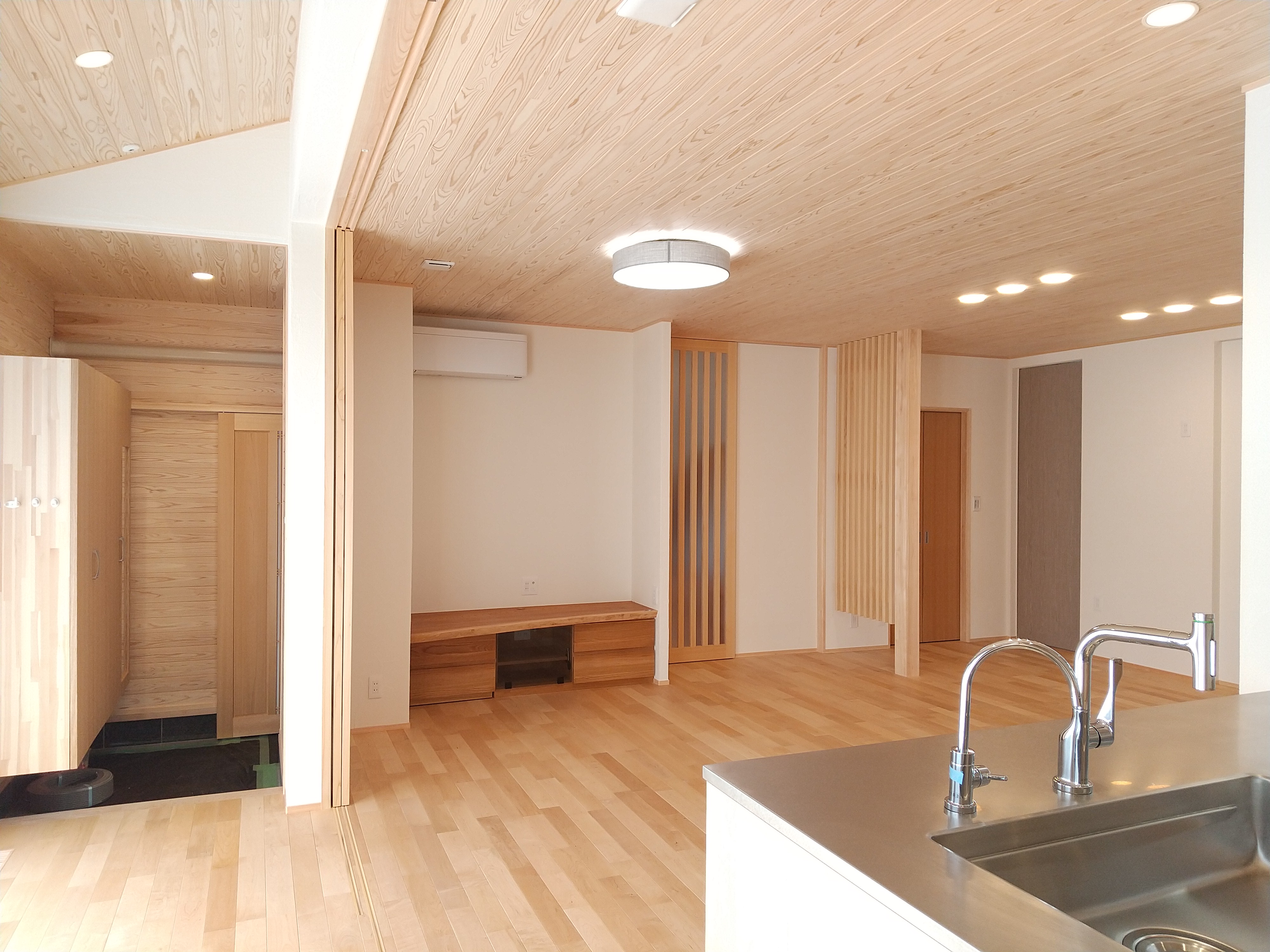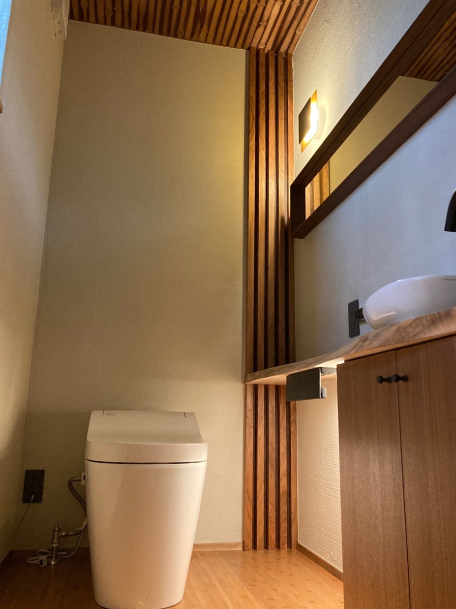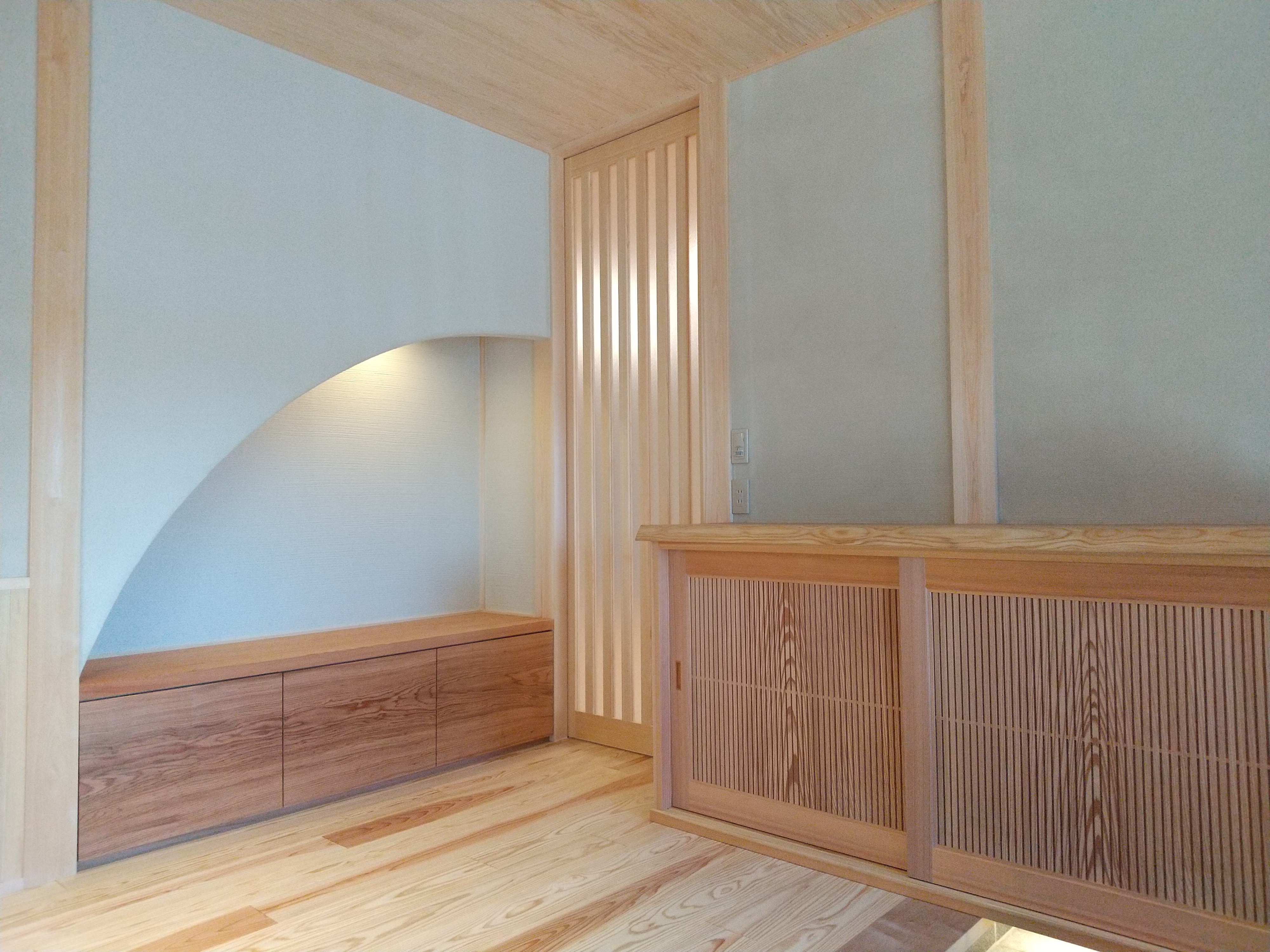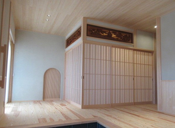 【延床面積】157.21㎡(57.55坪)/【工法】木造軸組工法/【断熱】基礎内:押出法発砲ポリスチレンフォーム 基礎外:ビーズ法ポリスチレンフォーム 基礎下:全面押出法ポリスチレンフォーム敷設 外壁:土壁:フェノール保温板+付加断熱高性能グラスウール 屋根:高性能グラスウール/【換気】第1種換気/【屋根・外壁】屋根:日本瓦 外壁:ジョリパット吹付仕上【開口部】樹脂サッシ(北側はトリプルガラス、その他ペアガラス)【内装】床:メープル材・杉材 壁:漆喰・珪藻土・杉材 天井:和紙クロス、桧・杉材/【UA値】0.26【ηA値】0.9【C値】0.6 長期優良住宅【耐震等級】3/【耐風等級】2