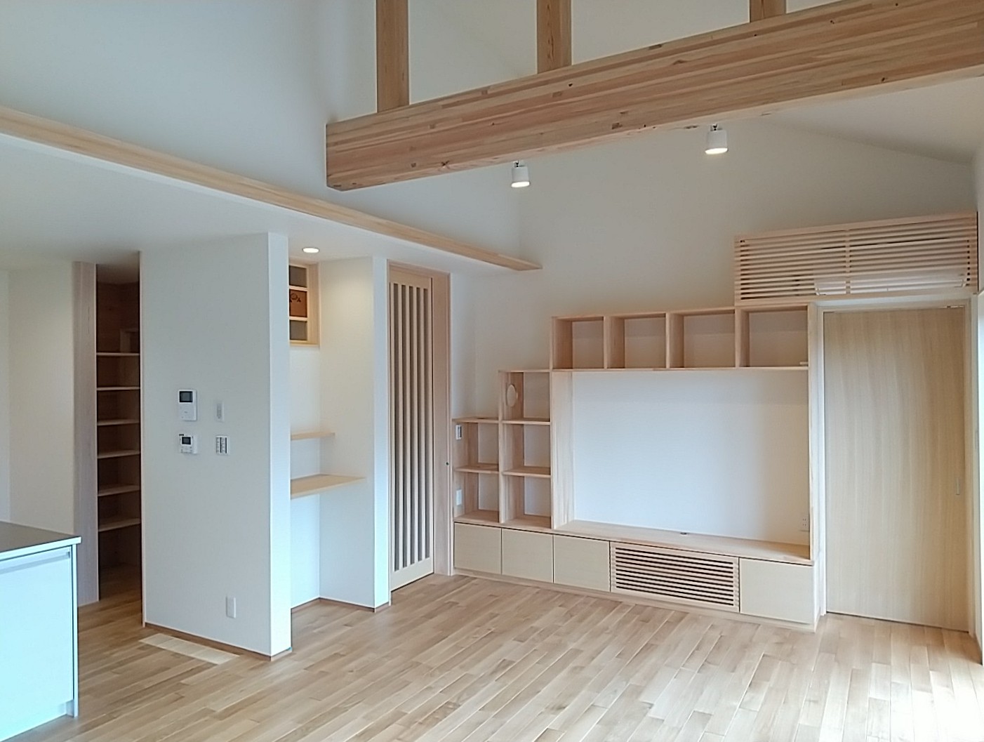 【延床面積】94.80㎡(28.68坪)/【工法】木造軸組工法/【断熱】基礎内:押出法ポリスチレンフォーム 外壁:高性能グラスウール+付加断熱高性能グラスウール 屋根:高性能グラスウール/【換気】第1種換気(熱交換換気扇)【屋根・外壁】屋根:平板瓦 外壁:弾性リシン吹付仕上げ【開口部】樹脂サッシ【内装】床:ナラ材 壁:クロス 天井:クロス、杉材/【UA値】0.33【ηA値】1.4【C値】0.7