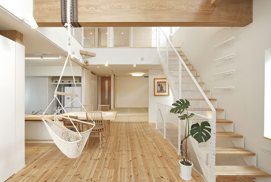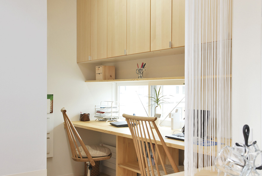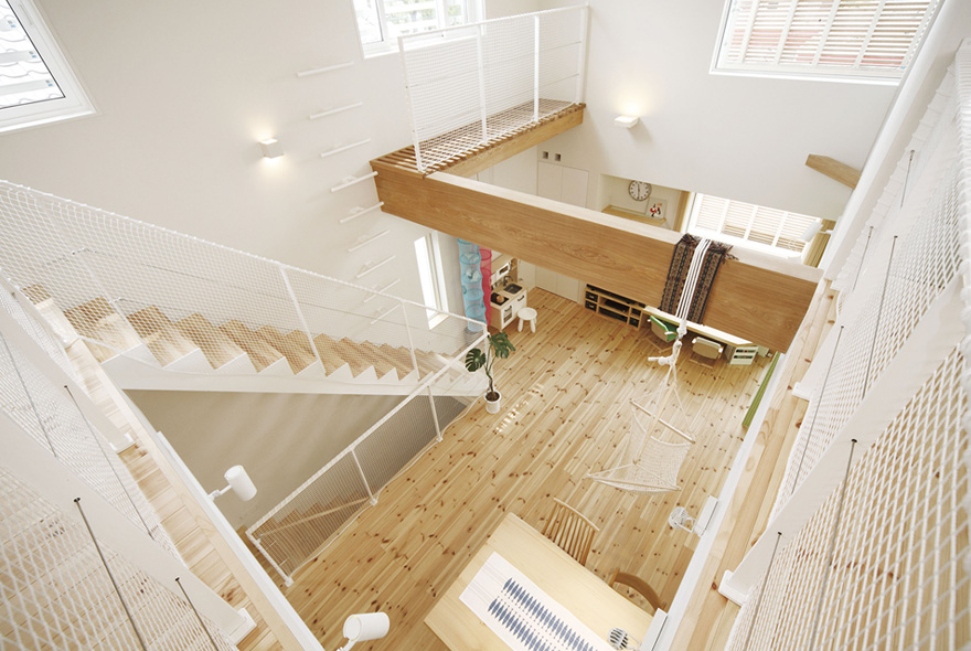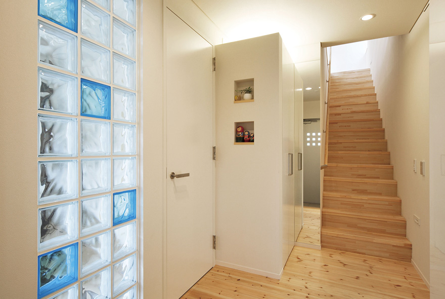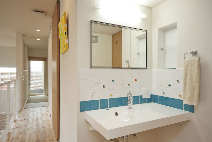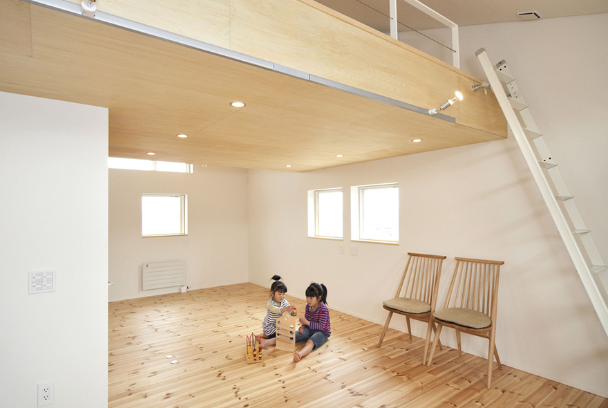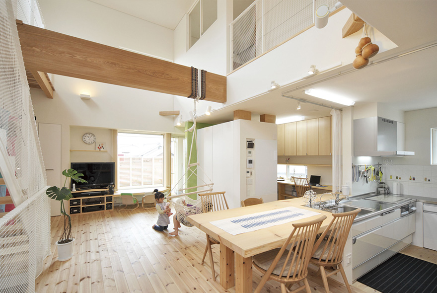 太陽光と風が部屋のすみずみまで行きわたるように、間取りや窓の配置を工夫したパッシブデザインのK様邸。無垢材の床をベースに、白を基調とした爽やかさが印象的だ。吹抜け空間が欲しくて高気密構造に詳しい会社を探した結果、同社に決めたK様。リビングに大胆な吹抜けをつくっても、高気密・高断熱構造のおかげで外気温に左右されない一年中快適な住まい。キッチンの床を1段低くして、リビングで遊ぶ子どもと目線が近くなる配慮を。PCを置くワークコーナーはリビングの気配がわかる優しい距離感。暮らしやすくデザイン性の高い住まいに大満足だ。