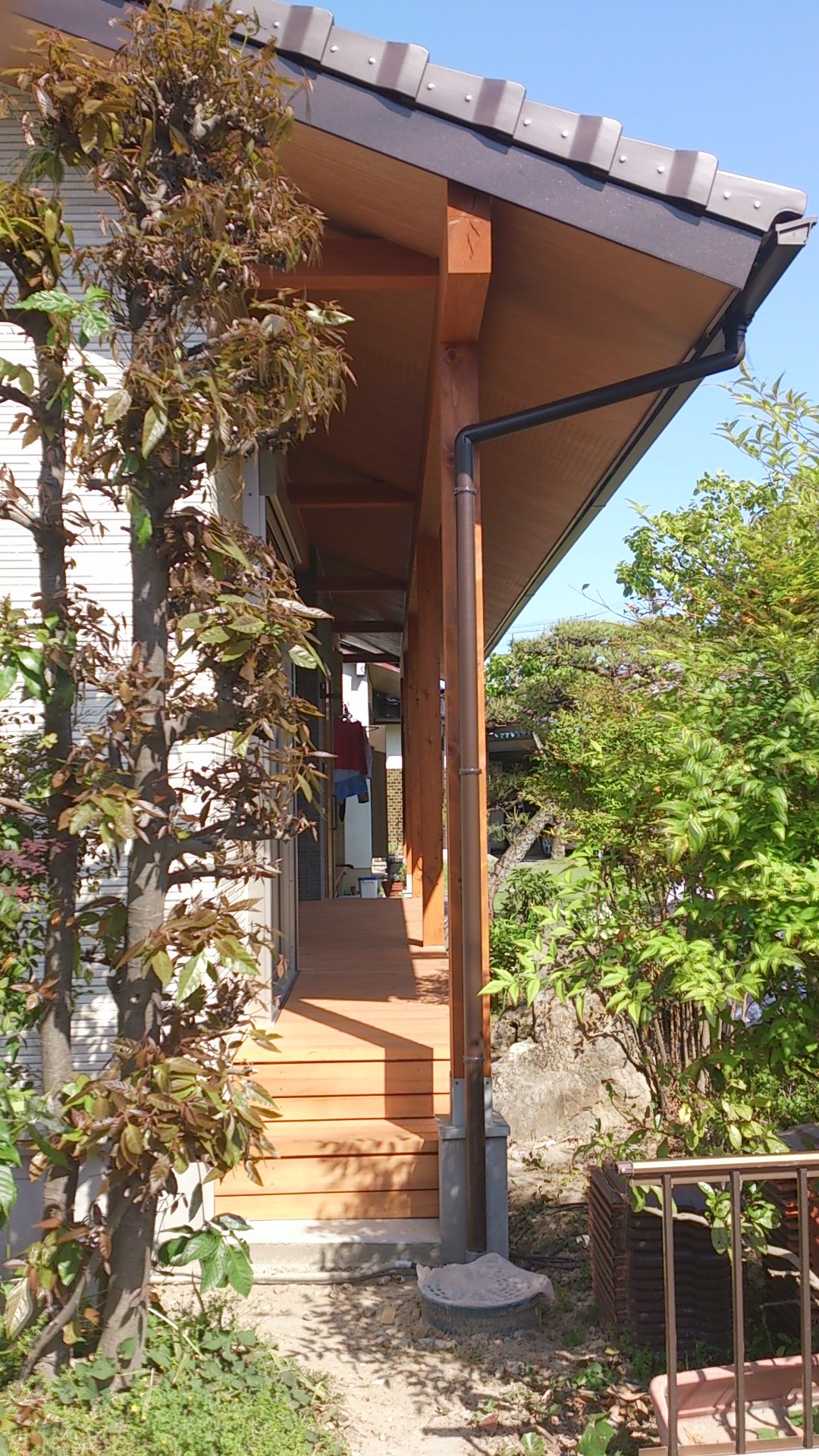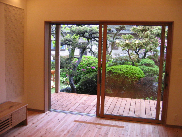 元々の主屋が老朽化し、建替えをご希望されたih様邸。新しい住宅はシンプルな和モダンの外観になりました。平屋建ての水平性を強調した瓦屋根と外部に採用した縦格子が雰囲気を醸し出します。居間の外部に巡らされたウッドデッキによって部屋の中からも、外部へ出ても庭の景色を楽しむことができます。