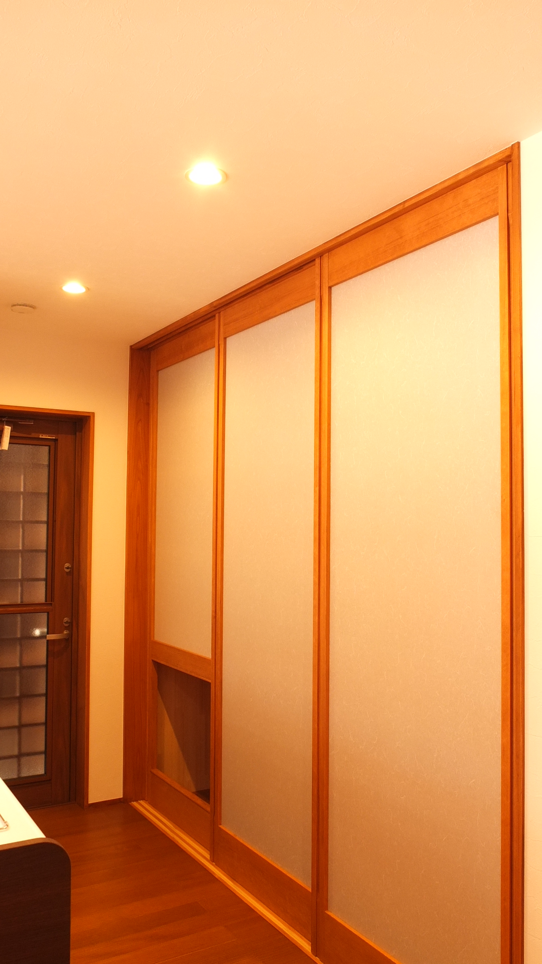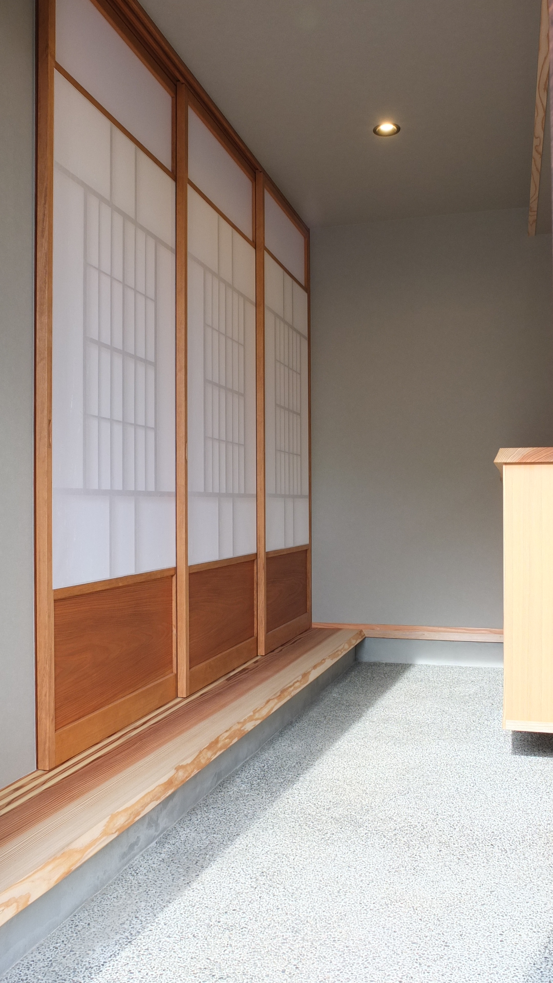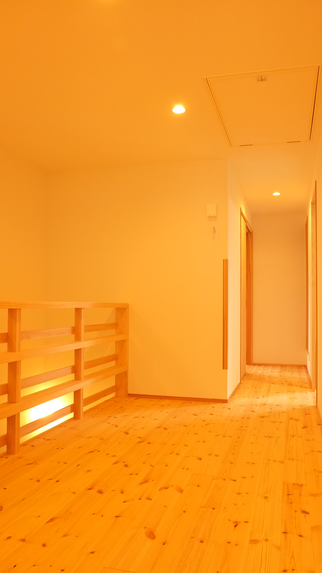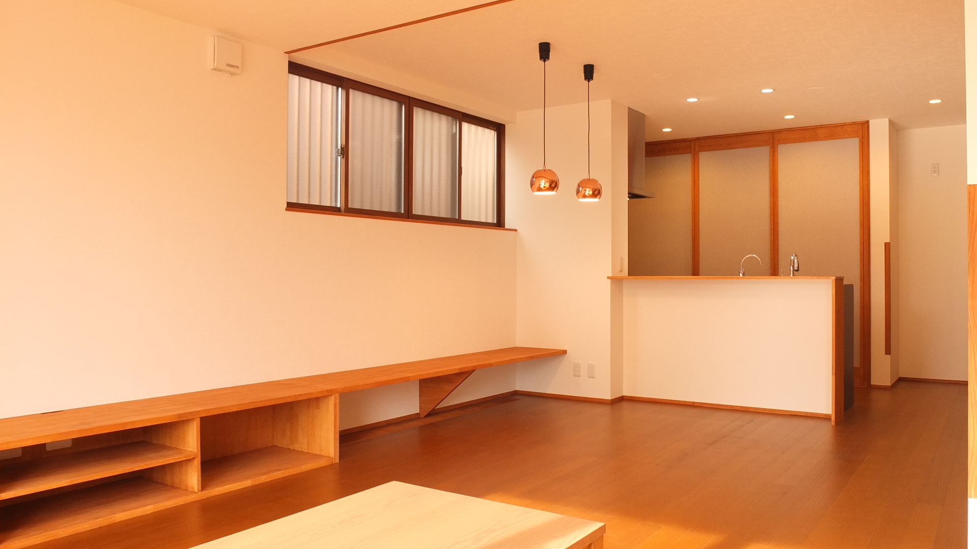 h様ご家族はお仕事の都合のため名古屋市にお住まいでしたが、お子様が生まれて住宅新築検討を機に土地探しから始められ、最終的にご両親のお住まいも近いこの地に決められました。敷地面積は大きいのですが、一部間口の狭まった変形地。ここに建てるのならばこの間口を逆手にとって極力シンプルな外観をつくってみようと計画し、最終的には箱が2層に重なったような特徴的な外観に。その外観に合わせて内部インテリアも、なるべくシンプルに仕上がるように工夫を凝らしました。